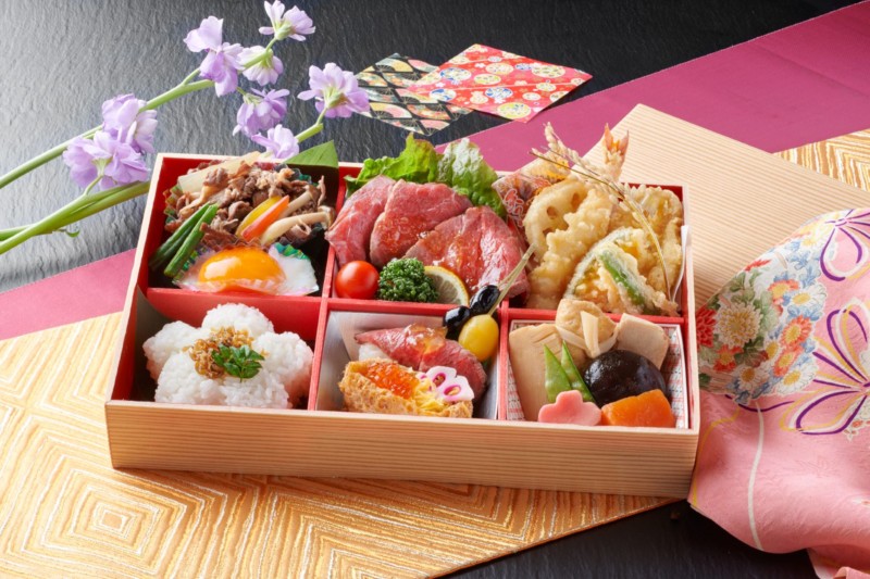 天ぷら、自家製ローストビーフ、牛すき(夏場は温泉玉子を煮玉子に変更いたします。)、煮物、ローストビーフにぎり・いくらいなり、白飯